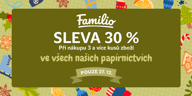 Zaskočte v úterý 27. prosince 2022 do našeho papírnictví Familio. Ve všech prodejnách na vás bude čekat povánoční výprodej, ve kterém zakoupíte psací potřeby, notesy či diáře a mnoho dalšího se slevou 30 %. Stačí když nakoupíte alespoň 3 ks jakéhokoliv zboží a sleva je vaše. Budeme se těšit na vaši návštěvu.