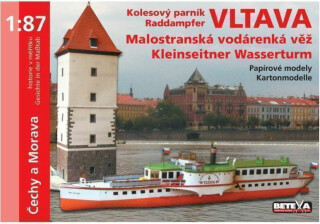 Pražská paroplavební společnost a její předchůdci provozovali říční parníky od 19. století. Ještě na přelomu 30. a 40. let 20. století si rámci modernizace flotily kromě motorových lidí nechala postavit také čtyři velké kolesové parníky. Jeden z nich vám Betexa přináší v podobě vystřihovánky. Kolesový parník Vltava, který je jednou částí vystřihovánky byl jedním z nich. Jeho délka je 53 m, šířka 5,1 m, na vodu byl spuštěn 1940. Kromě let 1942-45, kdy se jmenoval Moldau, jezdí stále pod původním názvem. V roce 1960 byl modernizován a prodloužen o nástavbu. Při celkové rekonstrukci (1991) byl přestavěn na restaurační salónní parník a byl rekonstruován parní kotel z pohonu uhlím na vytápění topným olejem.. Původní maximální počet míst byl 650, nynější kapacita je včetně sluneční terasy 200 míst. V součané době je parník v kompletní rekonstrukci. V provozu je nyní pouze parník Vyšehrad. Jiné funkční velké kolesové parníky v Česku nejsou. Malostranská vodárenská věž (Petržilkovská) stojí na místě Kartouzského mlýna, jehož vlastníkem byl na konci 15. století Jan Petržilka - odtud název. Kamenná věž byla postavena místo původní dřevěné vodárny asi v letech 1561 - 62, v 17. století ji opravil C. Lurago v renesančním stylu. Její nádrž v horním patře měla obsah 10,5 hektolitrů a rozváděla vodu do 57 kašen na Smíchově a Malé Straně. Svému účelu sloužila do roku 1886. Dnes je uživatelem stavby Vodohospodářský rozvoj a výstavba. V letech 1987 - 88 prošla rekonstrukcí a byla prosklenou lávkou spojena s přilehlou budovou na Smíchově podle návrhu arch. J. Petříkové. Petržilkovská věž je nejnižší vodárenskou věží v Praze, je vysoká cca 34 m. Petržilkovský ostrov je nejmenší pražský ostrov o velikosti 60×10 m. Díky těmto historickým faktům právem patří tato stavba mezi papírové modely H0. Vystřihovánky jsou ve dvou verzích: základní pro začátečníky a mírně pokročilé a pak přílohu s detaily, kterou ocení pokročilý a zkušený modelář.